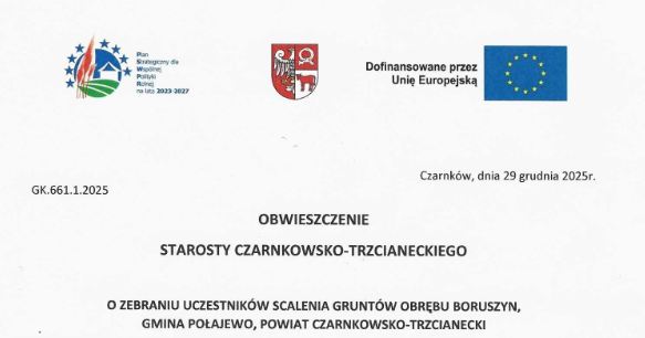 Ważna informacja dla mieszkańców Boruszyna Dnia 8 stycznia 2026 o godzinie 18:00 odbędzie się zebranie uczestników scalania w sali wiejskiej w Boruszynie. Zgodnie z Obwieszczeniem Starosty Czarnkowsko-Trzcianeckiego celem zebrania będzie: Wybór rady uczestników scalenia oraz przedstawienie etapów postępowania scaleniowego. Prośba…