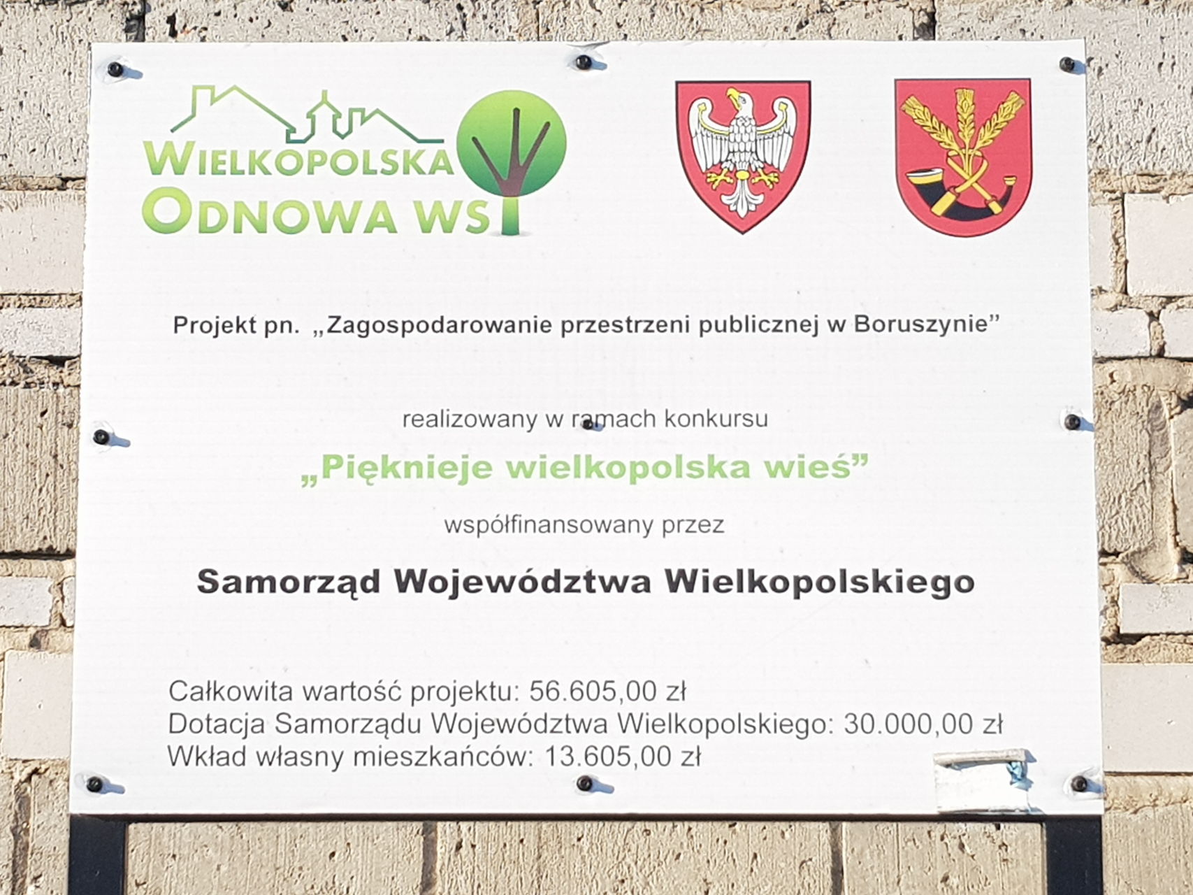 Projekt dotyczący wykonania prac budowlanych na terenie wsi Boruszyn został współfinansowany w ramach programu „Wielkopolska Odnowa Wsi 2013-2020” przez Samorząd Województwa Wielkopolskiego w wartości 30 000,00 zł. Do konkursu „Pięknieje wielkopolska wieś” łącznie zgłoszono 303 projekty, z których to poprzez ocenę formalną i merytoryczną wybrano 138, w tym znalazł się projekt Sołectwa Boruszyn pod nazwą „Zagospodarowanie przestrzeni publicznej w Boruszynie”.