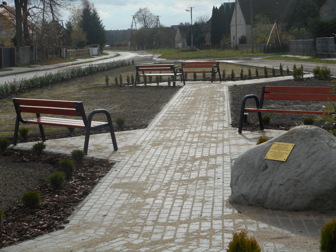 W ramach zagospodarowania placu wykonano przebudowę terenu, ułożenie kostki brukowej, posadzenie zieleni oraz trawników, a także zamontowano kosze na śmieci i ławki.