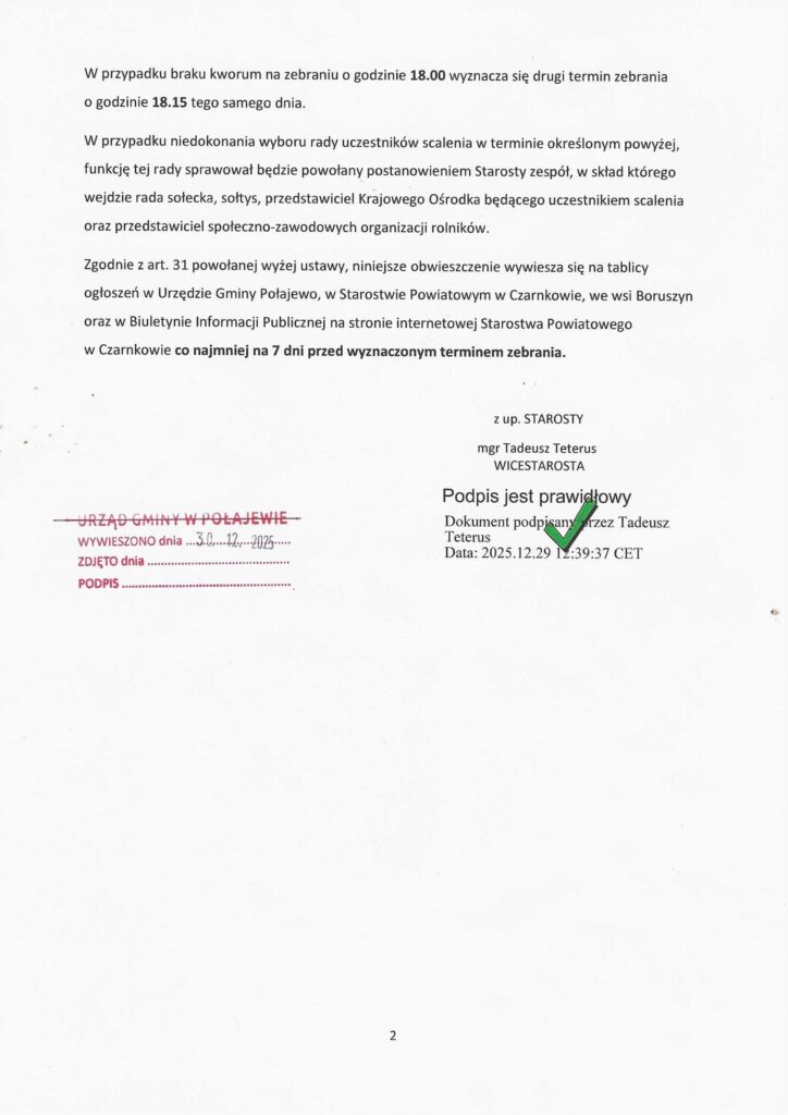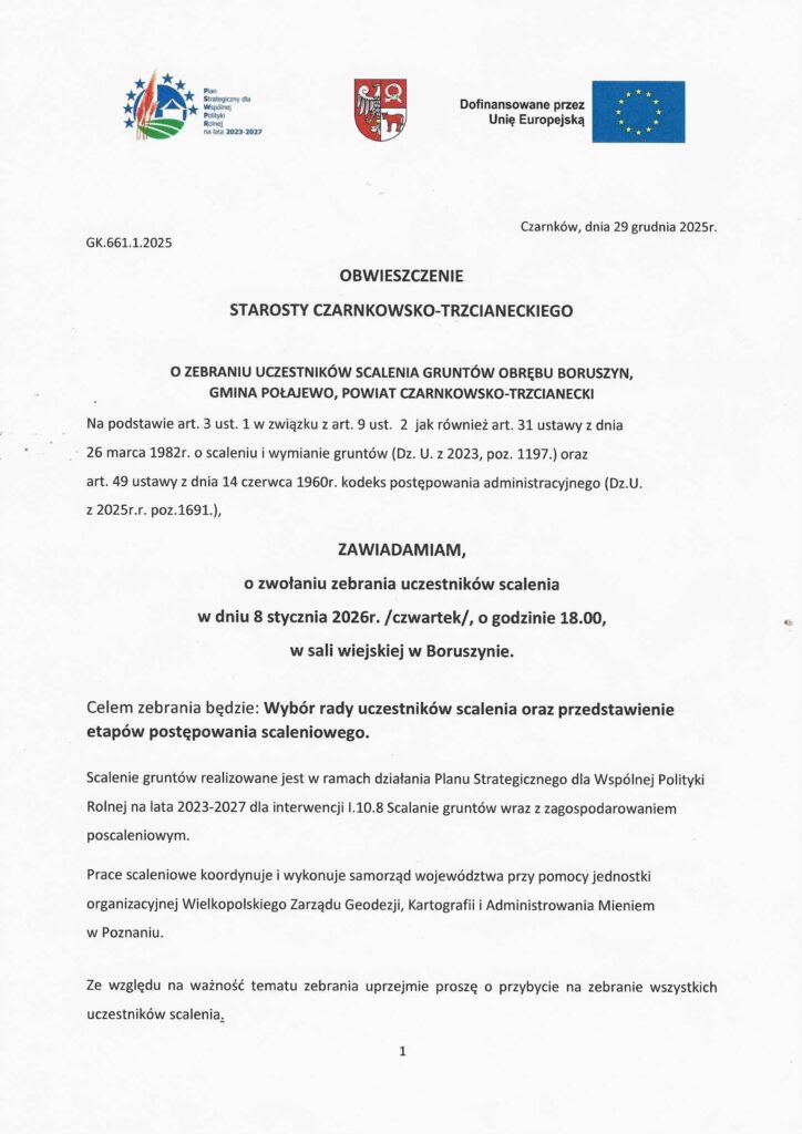 Dnia 8 stycznia 2026 o godzinie 18:00 odbędzie się zebranie uczestników scalania w sali wiejskiej w Boruszynie.